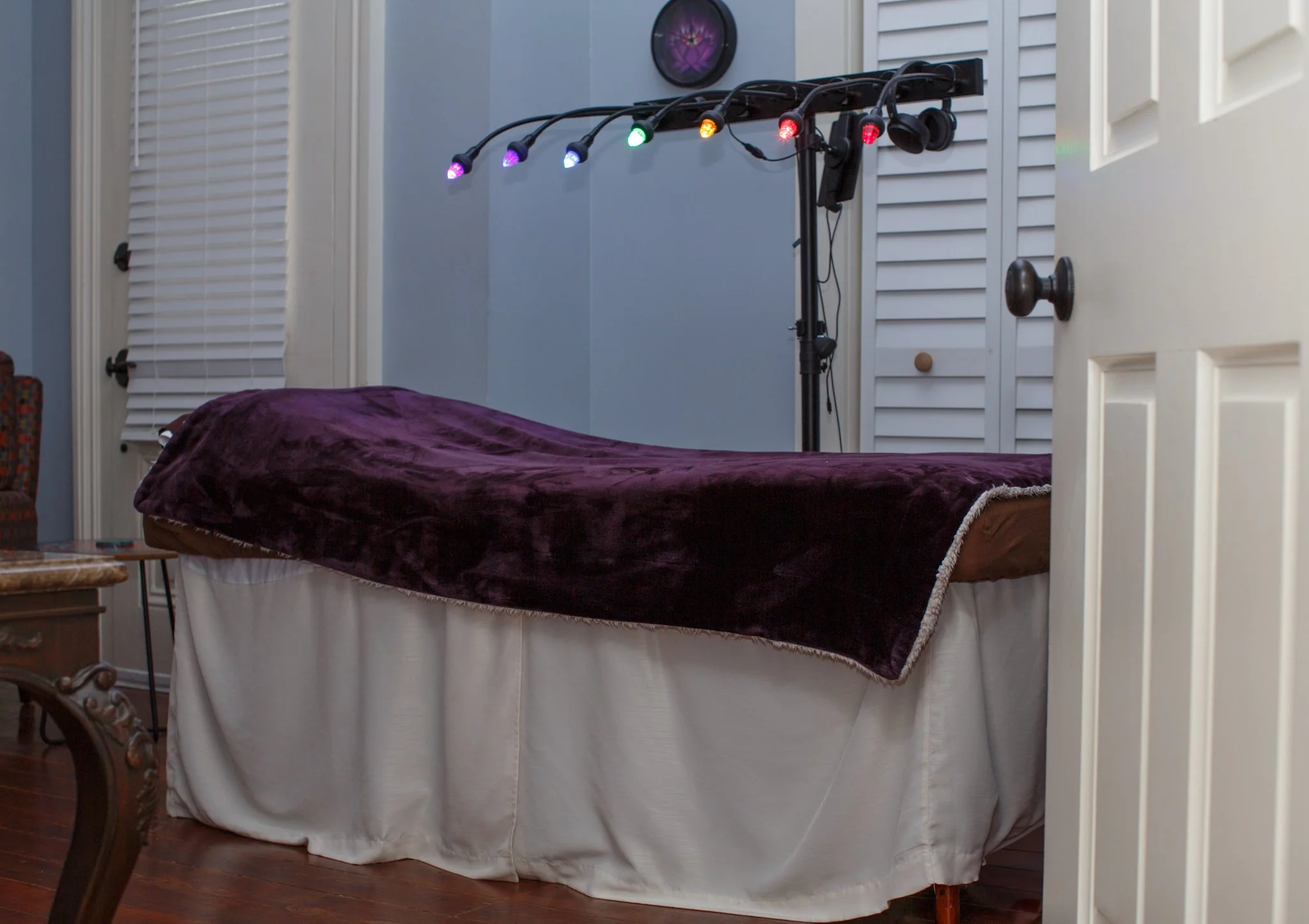 The healing properties of the bed are a result of a purposeful design that combines a specifically curated combination of frequencies and vibrations that organize brainwaves, which helps harmonize the body and promote cellular rejuvenation while chromatherapy (color) uses the complete visible spectrum to promote a restoration of natural balance. All together harmonized light, sound, and vibration are used to open the body towards healing and wellness. Additionally, the seven 24 sided Vogel-cut quartz crystals work by receive the generated frequencies and scalar energy and channeling them into the energy Chakras.